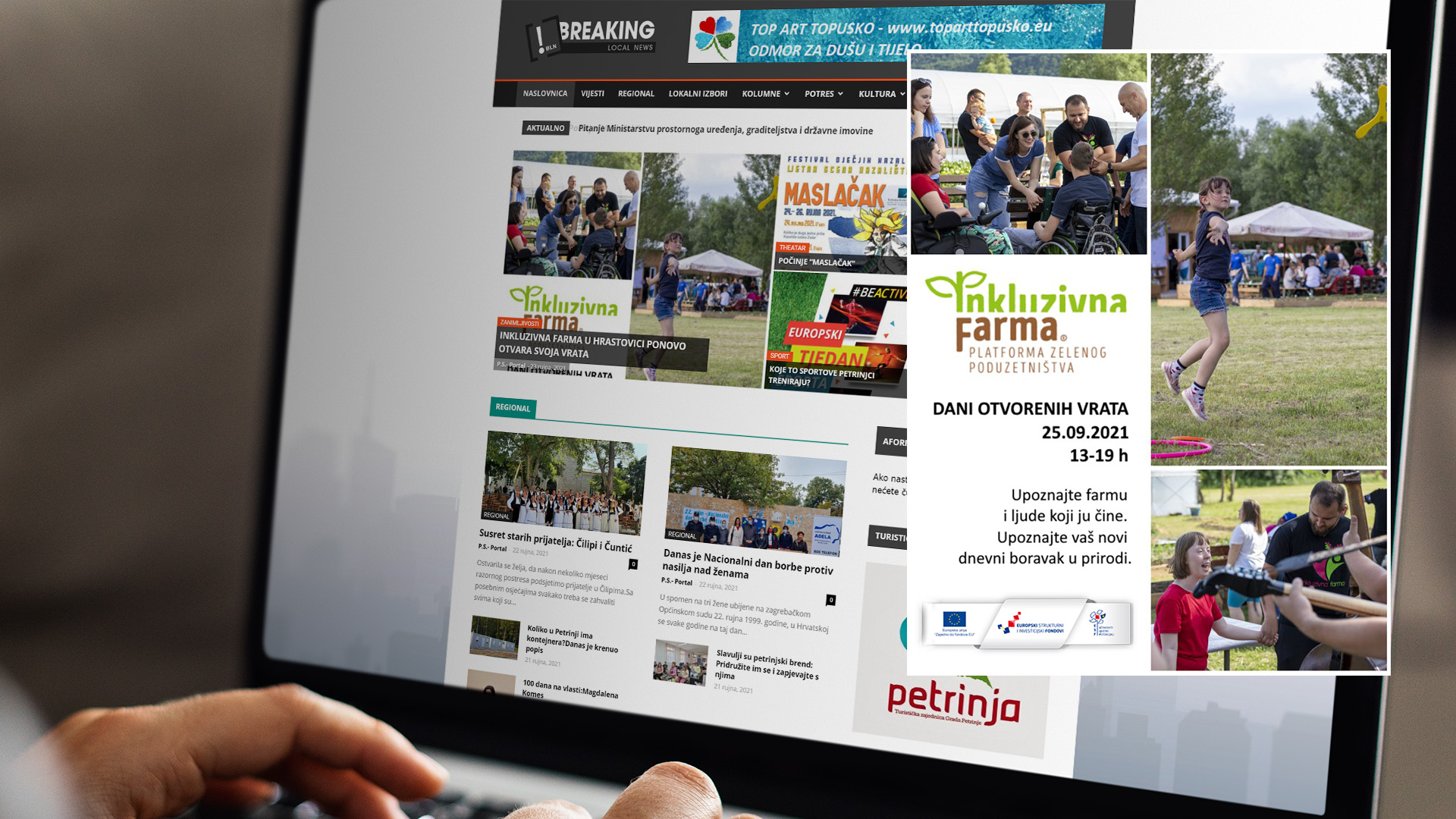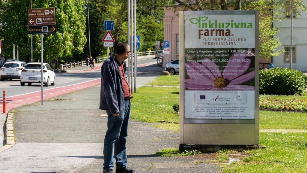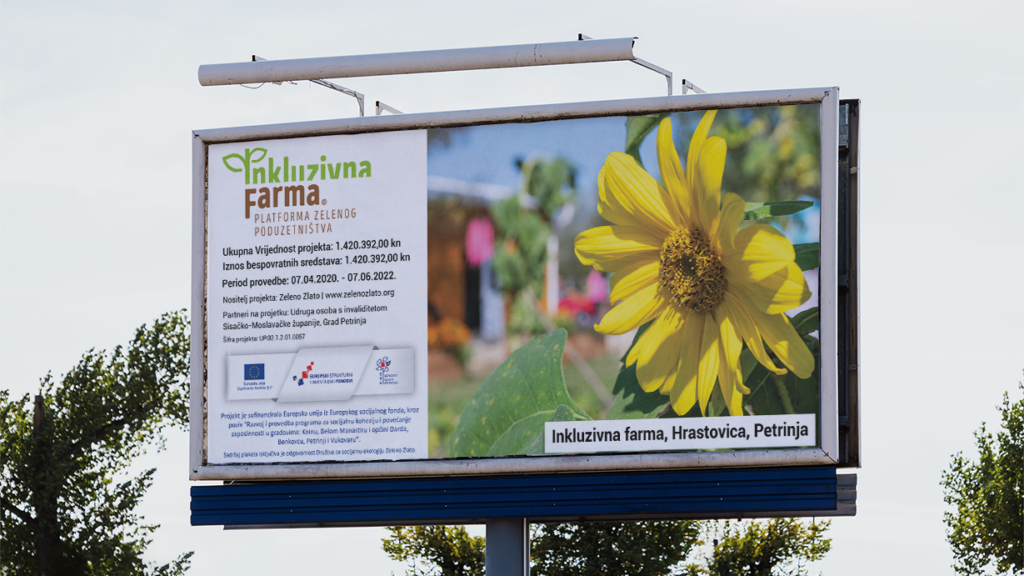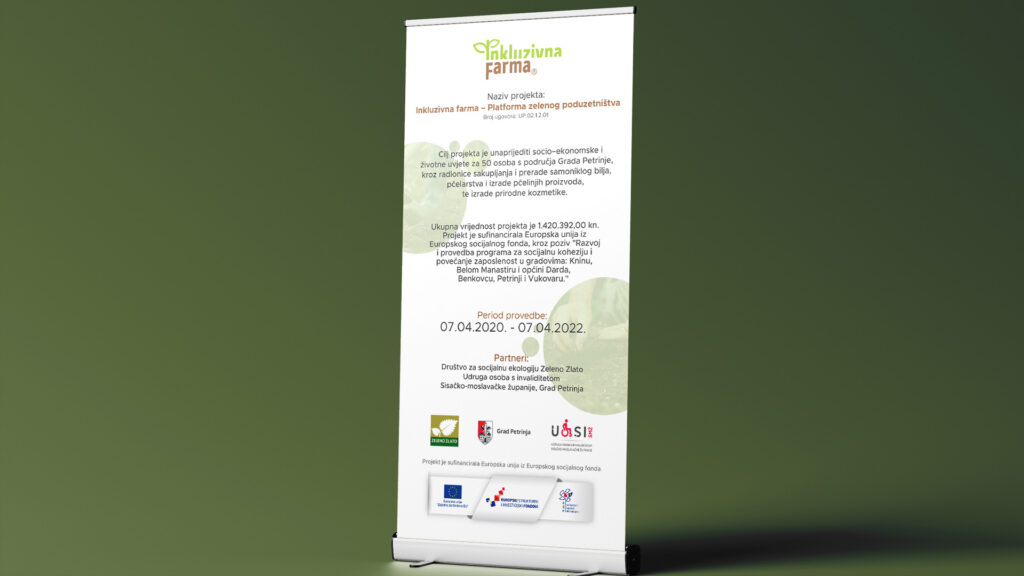 Projekt “Inkluzivna farma – Platforma zelenog poduzetništva” s idejom unaprijeđena socio-ekonomskog statusa i podizanja životnih uvjeta za osobe s invaliditetom i djece s teškoćama u razvoju Grada Petrinje. Projektna Produkcija je radila na vizualnom identitetu, izradi i pripremi promotivnih materijala; jumbo plakata, city light te radio oglašavanje. Snimili smo kratki video s kojim smo zabilježili sve faze projekta, snimali smo live stream završne konferencije inkluzivne farme i foto dokumentacijom popratili ovaj projekt u trajanju od tri godine.