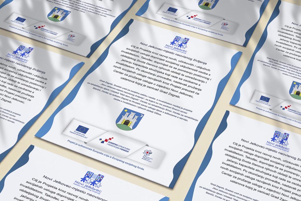 Grad Zagreb, Gradski ured za socijalnu zaštitu i osobe s invaliditetom nositelj je projekta „Novi Jelkovec-mjesto neovisnog življenja“, projekt se sastoji od mnoštvo partnera. Cilj projekta je kroz razvoj novih, učinkovitih i uključivih socijalnih usluga doprinijeti socijalnoj uključenosti osoba s invaliditetom. Projektna Produkcija na ovome projektu izradila je logo i vizualni identitet projekta, a nakon toga i tisak promotivnih materijala.